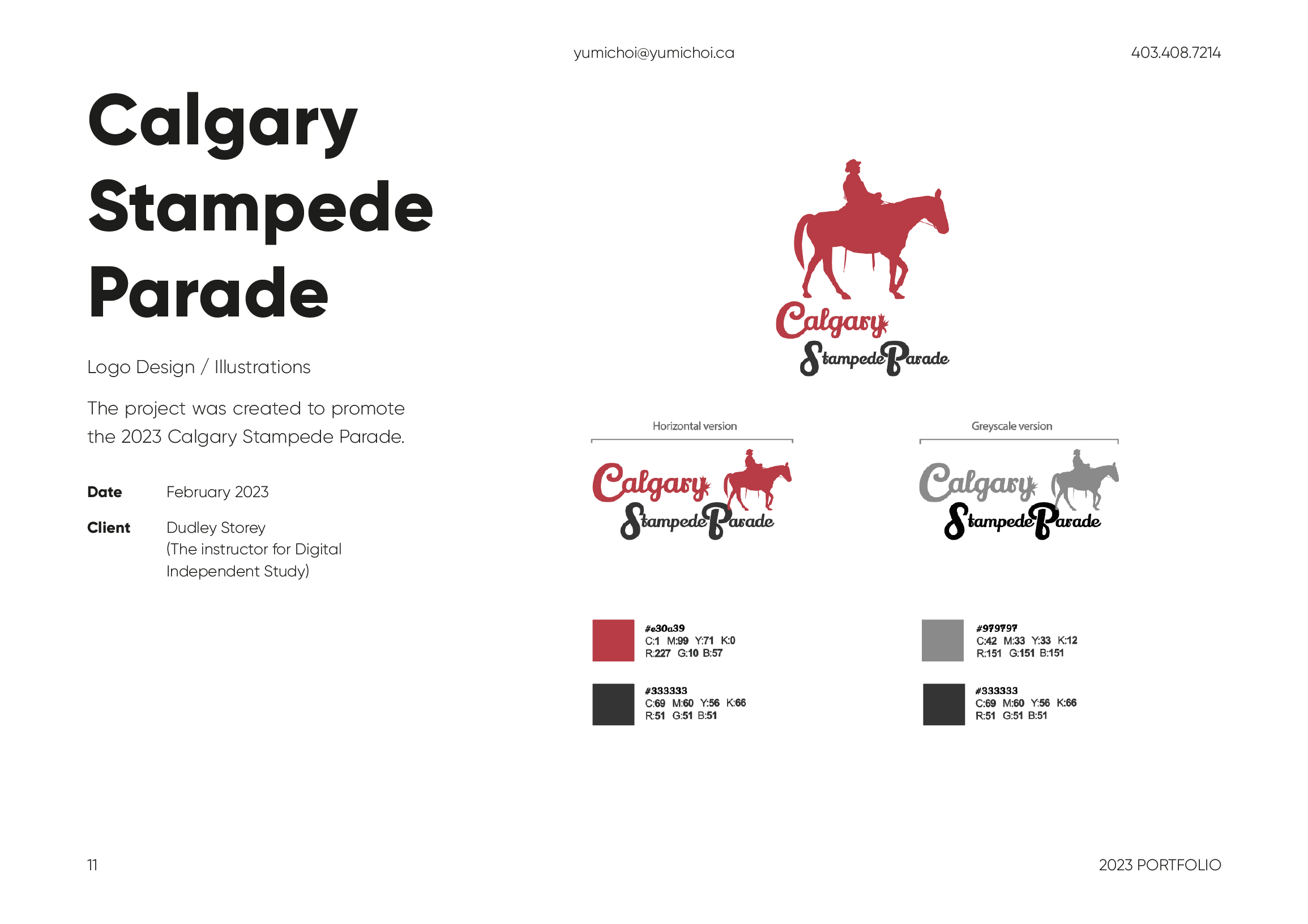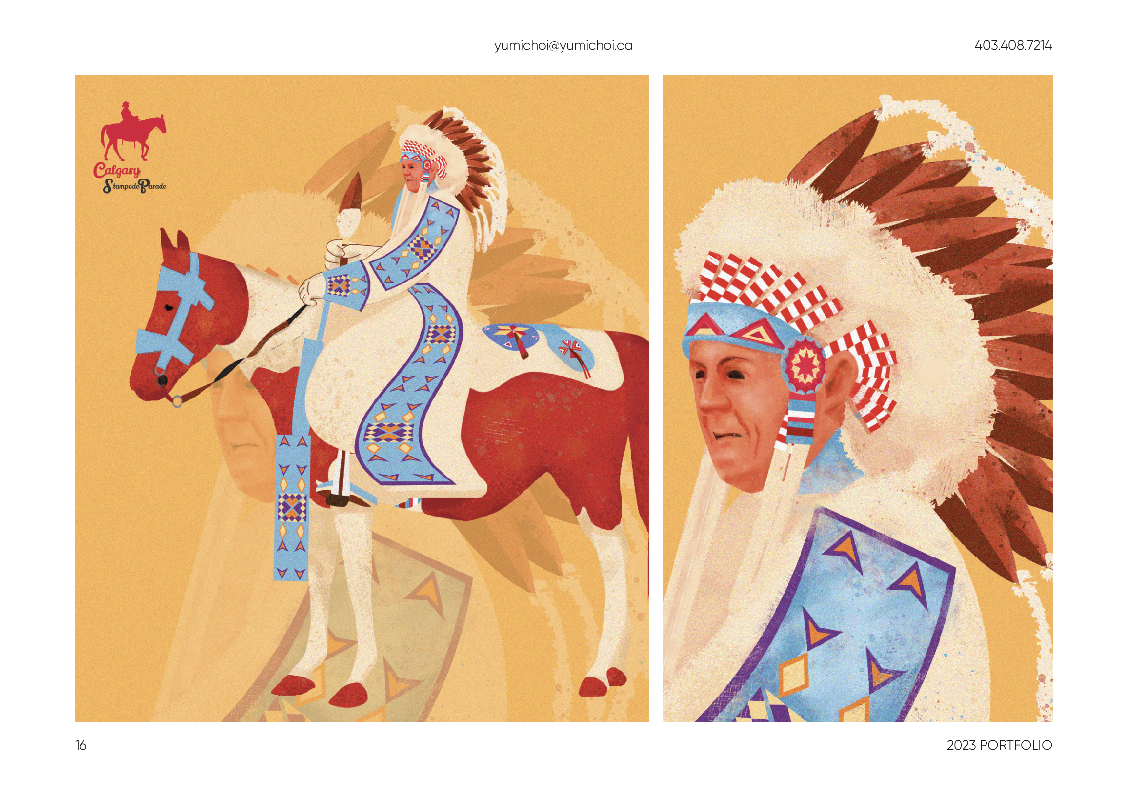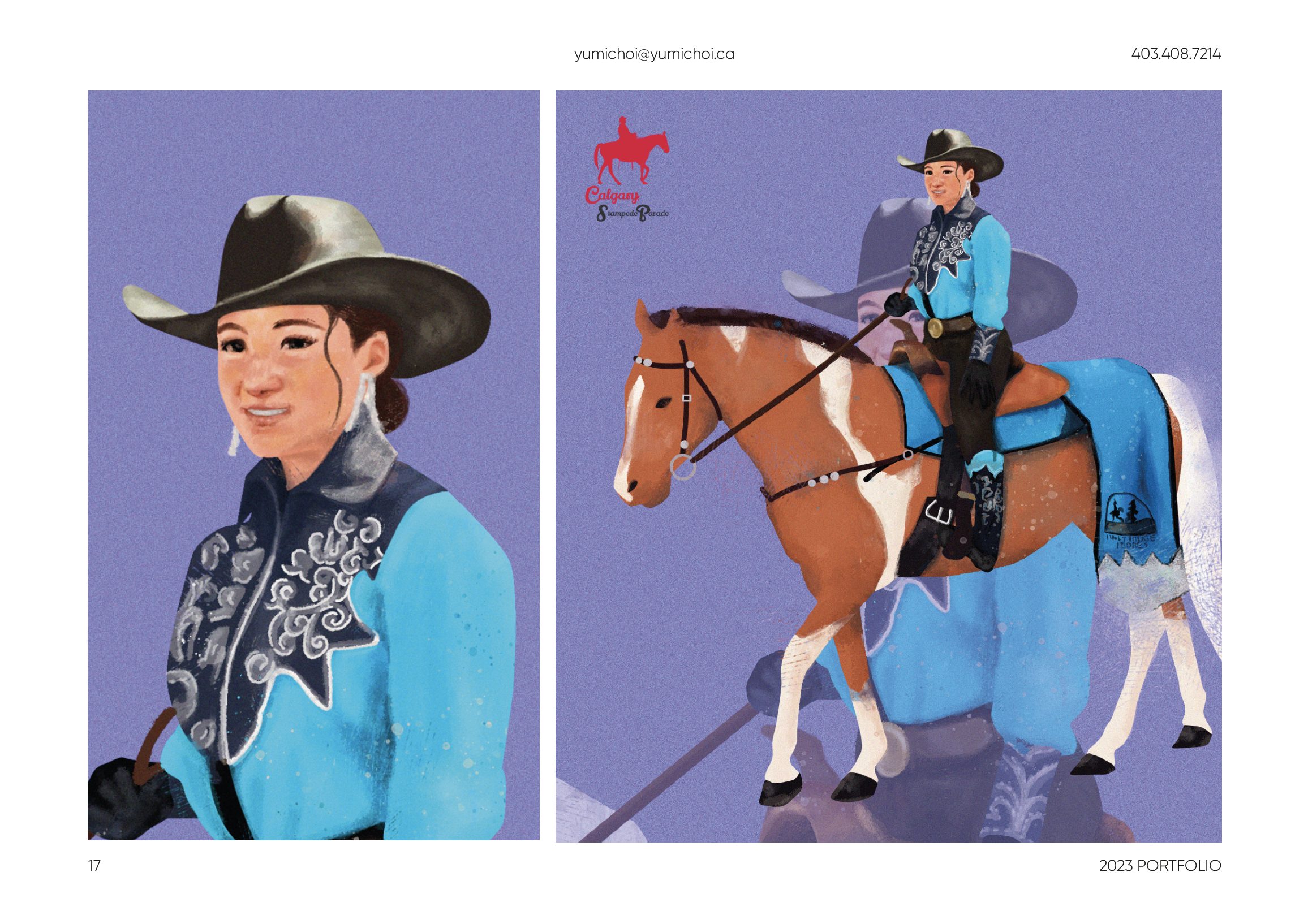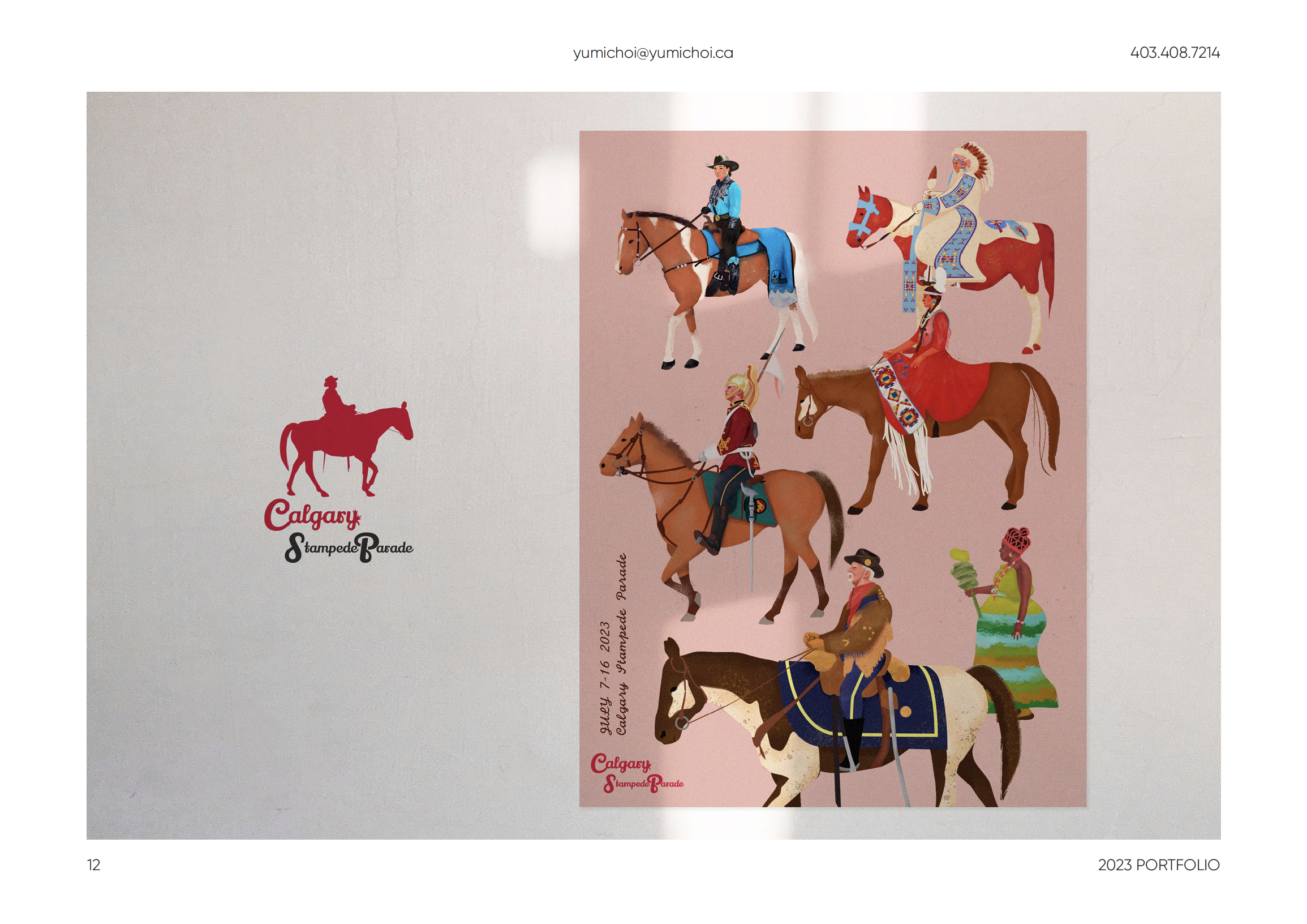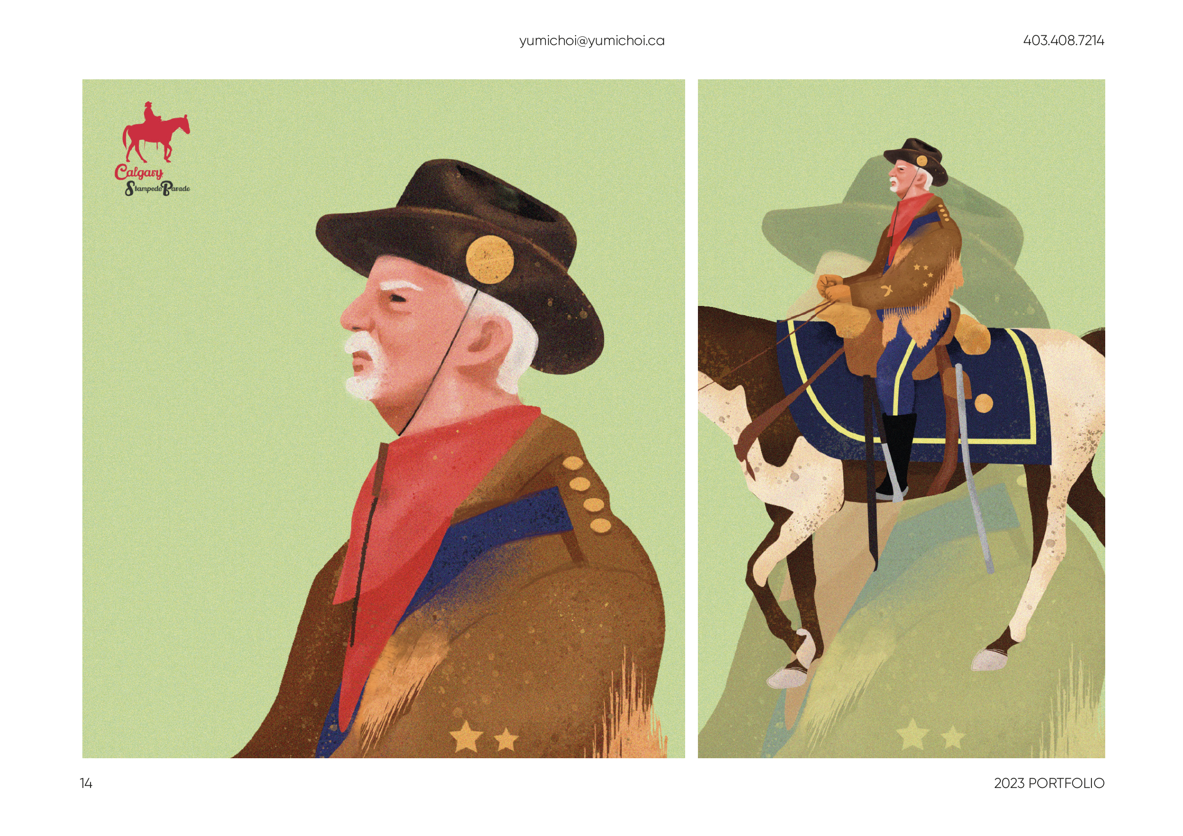 Client - Dudley Storey (The instructor for Digital Independent Study) The project was created to promote the 2023 Calgary Stampede Parade. The Calgary Stampede Parade is an annual event that is well-known to Calgary residents, but to me as a foreigner, it was a new and amazing sight. I was fascinated by the colorful costumes and lively performances of the parade participants, and I made an effort to capture their images through illustrations. 2023Personal Project
