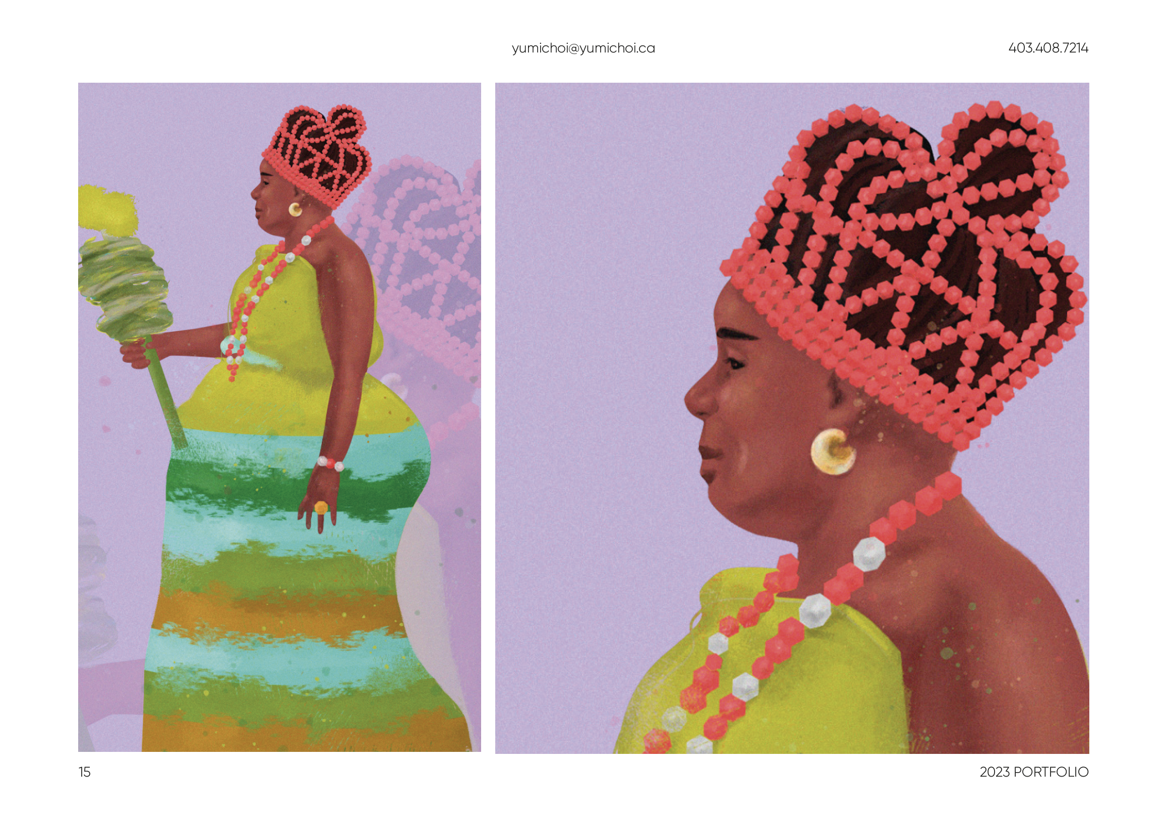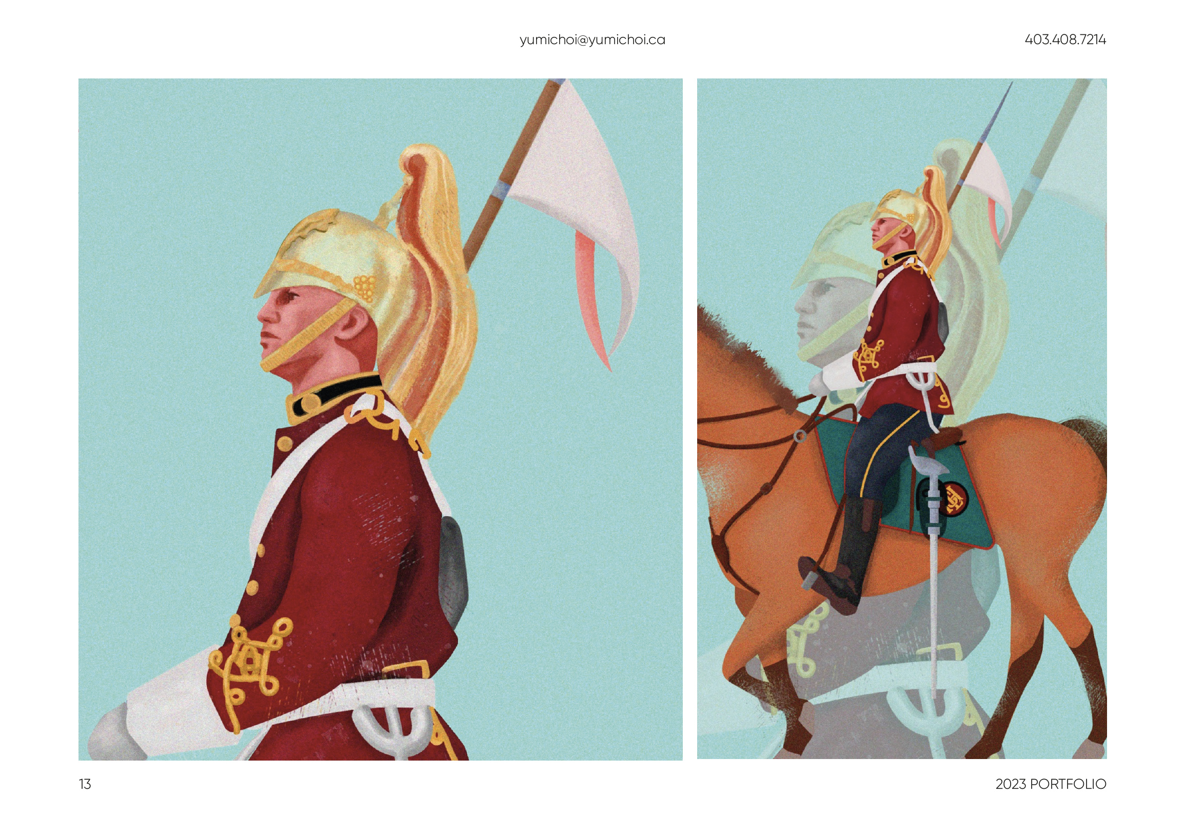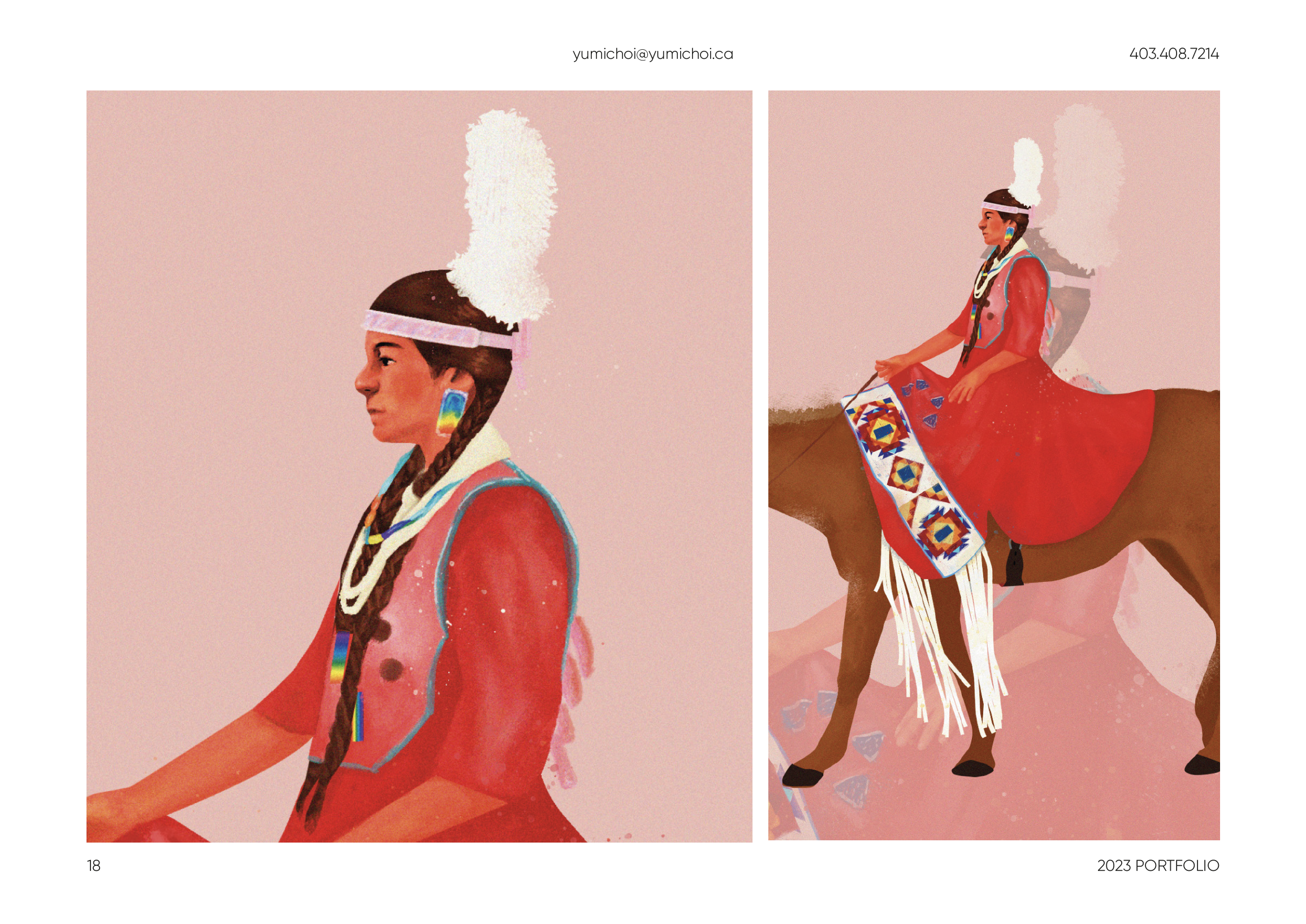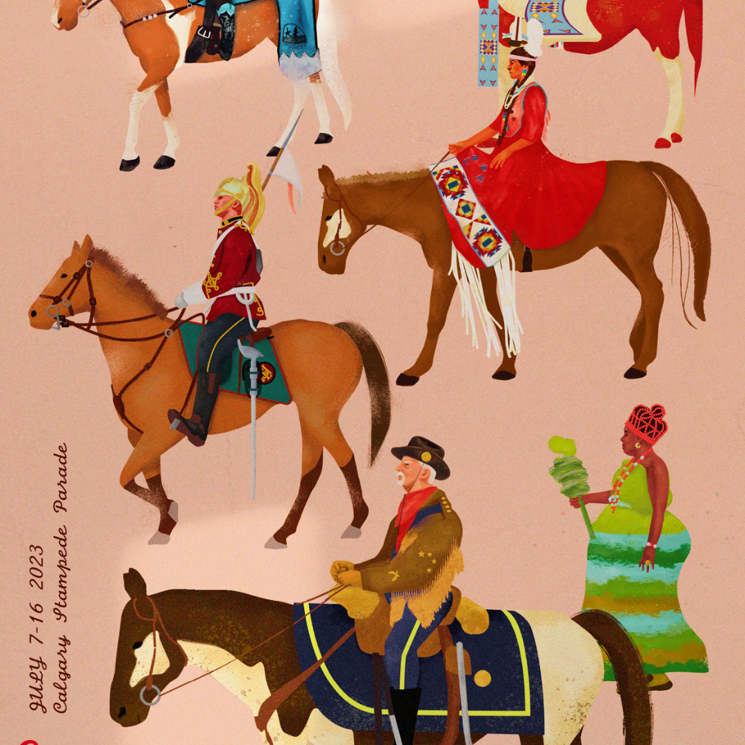 Client - Dudley Storey (The instructor for Digital Independent Study) The project was created to promote the 2023 Calgary Stampede Parade. The Calgary Stampede Parade is an annual event that is well-known to Calgary residents, but to me as a foreigner, it was a new and amazing sight. I was fascinated by the colorful costumes and lively performances of the parade participants, and I made an effort to capture their images through illustrations. 2023Personal Project